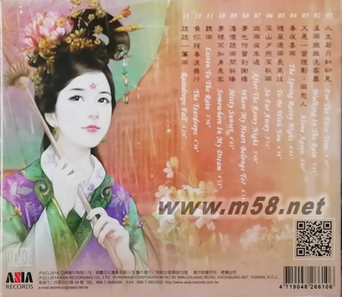 1 人生若只如初見 For The First Time 2 溪雨微微洗客塵 Walking In The Rain 3 又是一窗燈影、兩愁人 Alone Again 4 春夜喜雨 The Spring Rainy Night 5 隨風逐雨長來往 To Be With You 6 深山夕照深秋雨 So Far Away 7 微雨夜來過 After The Rainy Night 8 夢也何曾到謝橋 Where My Heart Belongs To? 9 澹煙疏雨間斜陽 Misty Sunset 10 夢里不知身是客 Somewhere In My Dream 11 聽雨 Listen To The Rain 12 負你殘春淚幾行 The Teardrops... 13 疏疏一簾雨 Raindrops Fall