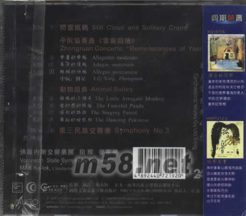 1.閑云孤鶴STILL CLOUD AND SOLITARY CRANE 中阮協奏曲<云南回憶>] ZHONGRUAN CONCERTO"REMINISCENCES OF YUNN 2.中庸的中板 ALLEGRETTO MODERATO 3.呆滯的慢板ADAGIO SOSTENUTO 4.機械的快板ALLEGRO MECCANICO 中阮:劉星 LIU XING.ZHONGRUAN 動物組曲ANIMAL SUITES 5.驕傲的小猴子 THE LITTLE ARROGANT MONKEY 6.愛幻想的熊貓THE FANCIFUL PANDA 7.唱歌的鸚鵡 THE SINGING PARROT 8.舞蹈的哈巴狗THE DANCING PEKINESE 9.第三民族交響樂SYMPHONY NO.3