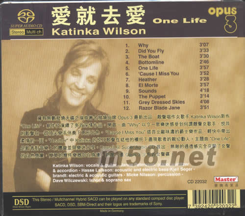 擁有無數發燒天碟之瑞典著名發燒品牌OPUS3最新出品,靚聲唱作女歌手KATINKA WILSON新作’ONE LIFE”,創作及演繹了多首深情作品。開首一曲“WHY”以令一眾樂迷感受到何謂靚聲女歌手,悅耳的歌聲在一群頂尖樂手伴奏下更顯出色。“GAUSE I MISS YOU”這首北歐味濃的爵士樂作品,輕快中帶出柔情的一面。”HEATHER“中”KATINKA的悅耳歌聲在結他的襯托下盡現歌者的親切動人。主題曲“ONE LIFE”是歌者對音樂上的體會并與樂迷分享。OPUS 3以SUPER AUDIO CD推出,無敵的通透感完全突顯了女聲的自然感覺。。簡單的幾個樂器如在身邊,這是一張OPUS3少有的女聲碟