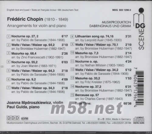 1.NOCTURNE OP.27,1 ARR.BY PABLO DE SARASATE(1844-1908) 2.WALTZ/VALSE/WALZER OP.64,2 ARR.BY BRONISLAW HUBERMAN(1844-1947) 3.MAZURKA OP.68,4 ARR.BY ZINO FRANCESCATTI(1902-1991) 4.NOCTURNE OP.55,2 ARR.BY JOAN MANEN(1883-1971) 5.WALTZ/VALSE/WALZER OP.64,3 ARR.BY PABLO DE SARASATE(1844-1908) 6.NOCTURNE OP.9,2 ARR.BY PABLO DE SARASATE(1844-1908) 7.WALTZ/VALSE/WALZER OP.34,3 ARR.BY PABLO DE SARASATE(1844-1908) 8.LITHUANIAN SONG OP.74,16 ARR.BY LEOPOLD AUER(1845-1930) 9.WALTZ/VALSE/WALZER OP.70,1 ARR.BY BRONISIAW HUBERMAN(1882-1947) 10.MAZURKA OP.7,3 ARR.BY BRONISIAW HUBERMAN(1882-1947) 11.NOCTURNE O.OP. ARR.BY NATHAN MILSTEIN(1903-1992) 12.WALTZ/VALSE/WALZER OP.34.2 ARR.BY PABLO DE SARASATE(1844-1962) 13.MAZURKA OP.37,2 ARR。BY FRITZ KREISLER(1875-1962) 14.NOCTURNE OP。37,2 ARR.BY BRONISSLAW HUBERMAN(1882-1947) 15.BERCEUSE OP.57 ARR.BY CHARLES CERNE(1879-1943)