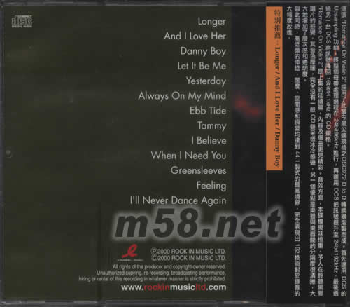 價(jià)格為估,以實(shí)到貨為準(zhǔn)! ROMANCE ON VIOLIN 2 世紀(jì)經(jīng)曲小提琴音樂集2(m58.net) 這張“ROMANCE ON VIOLIN 2”采用了此當(dāng)今最 尖端規(guī)格之DSC972D TO D 轉(zhuǎn)換器泡制而成。首先運(yùn)用DCS的UPSAMPLING功能,將整個(gè)母帶處理過程在24BIT96KHZ進(jìn)行,再運(yùn)用DCS把訊號提升至24BIT192KHZ,最后透過另一臺DCS將訊號降回16VUT44。1KHZ的CD規(guī)格。 ROMANCE ON VIOLIN 2 是上集的延繼篇,內(nèi)容及選曲更見精彩。音效方面,本碟模擬味極重,予 人在聽黑膠唱片的感覺,其音色厚暖,完全沒有一般CD聲呆板冰冷感受覺,另一個(gè)優(yōu)點(diǎn)是樂器與樂器間的分隔度很清晰,大大地增加了層次感受和透明度。與此同時(shí),高低頻的伸延,闊度/空間感和瞬變均達(dá)到44。1制式的最高境界,完全表現(xiàn)出192技術(shù)對於錄音的大幅度改進(jìn)。