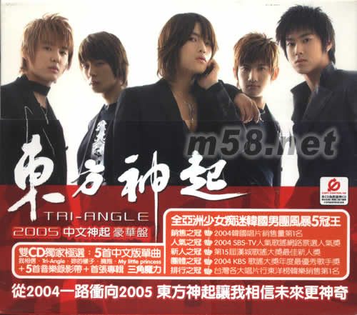 2005中文神起 TRI-ANGLE豪華盤(m58.net) Xiah細(xì)亞+Micky有天+Hero在中+Max昌珉+U-Know允浩=東方神起 亞洲超人氣魅力男孩團(tuán)體[東方神起],這股東方風(fēng)暴一路從2004年延燒到2005年,出道不過一年,單曲、專輯的銷售成績已創(chuàng)下八十萬張的驚人紀(jì)錄,不停奔波于韓、日、中三地宣傳的他們,各大小獎(jiǎng)項(xiàng)更是拿個(gè)不停,新人獎(jiǎng)、人氣獎(jiǎng)、歌謠大獎(jiǎng)...等等,相信這5個(gè)年紀(jì)輕輕的大男孩引領(lǐng)韓流炫風(fēng)再創(chuàng)高峰。 從靦腆清澀愛意的[Hug擁抱]到略顯成熟魅力的[The Way U are你的樣子],東方神起希望每次都能給大家不同的感受;主打單曲[我相信]鋼琴與弦樂合鳴的R&B抒情巨構(gòu),坦露東方神起最私密真實(shí)的少男情愛心事;專輯同名單曲[TRI-ANGLE]共收錄兩種版本,采用莫札特第40號(hào)交響曲第一樂章做為導(dǎo)入,Hip Rock風(fēng)格以強(qiáng)憾搖滾吉他搭著嘻哈節(jié)拍,并不時(shí)穿插弦樂式的古典音樂襯底,別出心裁,歌詞中反應(yīng)社會(huì)新聞中常出現(xiàn)的被害者、加害人及旁觀者,將之比喻為Triangle三角關(guān)系,但大部分的人們最后都選擇冷眼旁觀,結(jié)果很可能會(huì)招致同樣的下場。 行程滿檔的東方神起特地抽空進(jìn)錄音室錄制了5首中文歌曲收錄在亞洲特別版專輯中獻(xiàn)給亞洲地區(qū)的歌迷們,另外還多加贈(zèng)了5支精彩MTV一併收錄在其中,絕對超值的特別版專輯,一份新年最好的禮物,你,還在等什么? 全亞洲少女癡迷韓國男團(tuán)風(fēng)暴5冠王 銷售之冠:2004韓國唱片銷售量第1名 人氣之冠:2004 SBS-TV人氣歌謠網(wǎng)路票選人氣獎(jiǎng) 新人之冠:第15屆漢城歌謠大獎(jiǎng)最佳新人獎(jiǎng) 團(tuán)體之冠:2004 KBS 歌謠大獎(jiǎng)年度最優(yōu)秀歌手獎(jiǎng) 排行之冠:臺(tái)灣各大唱片行東洋榜韓樂銷售第1名