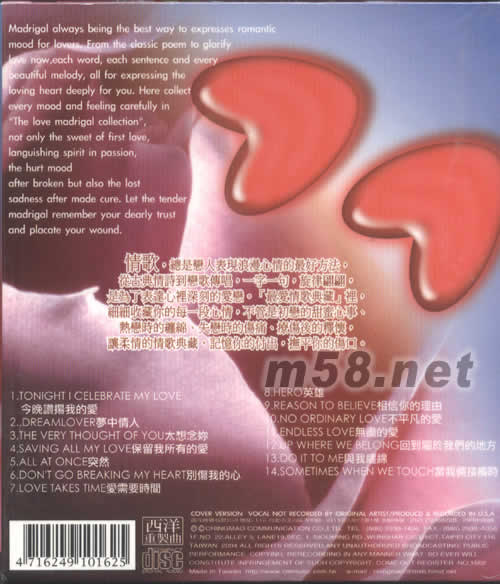 1、TONIGHT I CELEBRATE MY LOVE 今晚贊揚我的愛 2、DREAMLOVER 夢中情人 3、THE VERY THOUGHT OF YOU 太想念你 4、SAVING ALL MY LOVE 保留我所有的愛 5、ALL AT ONCE 突然 6、DON’T GO BREAKING MY HEART 別傷我的心 7、LOVE TAKES TIME 愛需要時間 8、HERO 英雄 9、REASON TO BELIEVE 相信你的理由 10、NO ORDINARY LOVE 不平凡的愛 11、ENDLESS LOVE 無盡的愛 12、UP WHERE WE BELONG 回到屬于我們的地方 13、DO IT TO ME 與我纏綿 14、SOMETIMES WHEN WE TOUCH 當我倆接觸時