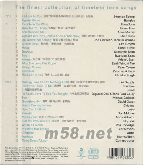 CD 1 01、It Might Be You 德斯汀荷夫曼主演的電影[杜絲先生]主題曲 -Stephen Bishop 02、Eternal Flame -Bangles 03、Candle In The Wind -Elton John 04、The One You Love 張國榮[再戀]英文原曲 -Glenn Frey 05、You Needed Me -Anne Murray 06、Against All Odds(Take A Look At Me Now) 電影[危情]主題曲 -Plil Collins 07、Up Where We Belong 電影[沖上云霄]插曲 -Joe Cocker&Jennifer Warnes 08、Ocean Deep 劉美君[愛是無涯]英文原曲 -Cliff Richard 09、Hello -Lionel Richie 10、Emotion -Samantha Sang 11、True -Spandau Ballet 12、Always 林子祥[結(jié)伴同行]英文原曲 -Atlantic Starr 13、After The Love Has Gone -Earth Wind & Fire 14、Glory Of Love -Peter Cetera 15、Reunited -Peaches & Herb 16、The Lady In Red 電影[打工女郎]插曲 -Chris De Burgh CD 2 01、Making Love Out Of Nothing At All 電影[史密夫決戰(zhàn)史密妻]插曲 -Air Supply 02、I've Never Been To Me 周慧敏[孤單的心痛]英文原曲 -Charlene 03、If 美國榜殿軍歌曲 -Bread 04、I'd Really Love To See You Tonight 76年全美亞軍單曲 -England Dan & John Ford Coley 05、Ben -Michael Jackson 06、Goodbye Girl 電影[再見女郎]主題曲 -David Gates 07、You're The Inspiration -Chicago 08、How Can I Tell Her -Lobo 09、Vincent -Don McLean 10、Moon River 韓劇[巴黎戀人]插曲 -Andy Williams 11、Just The Way You Are 譚詠麟[可會有明天]英文原曲 -Billy Joel 12、We're All Alone -Rita Coolidge 13、Morning Has Broken -Cat Stevens 14、Chiquitita -Abba 15、Feelings -Morris Albert 16、Three Times A Lady -Commodores