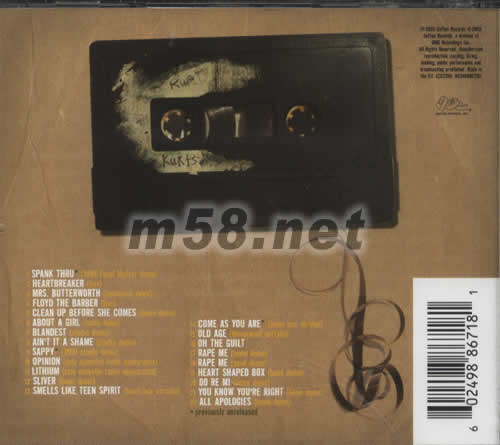 1. Spank Thru (1985 Fecal Matter Demo) (Previously Unreleased) 2. Heartbreaker (Live) 3. Mrs. Butterworth (Rehearsal) 4. Floyd The Barber (Live) 5. Clean Up Before She Comes (Solo Acoustic Demo) 6. About A Girl (Solo Acoustic Demo) 7. Blandest (Demo) 8. Ain't It A Shame ( Demo ) 9. Sappy (1990 Studio Demo) (Previously Unreleased) 10. Opinion (Live Solo Acoustic) 11. Lithium (Live Solo Acoustic) 12. Sliver (Solo Acoustic Demo) 13. Smells Like Teen Spirit (Rehearsal Demo) 14. Come As You Are (Boom Box Version) (Previously Unreleased) 15. Old Age (Outtake) 16. Oh The Guilt (B-Side) 17. Rape Me (Solo Acoustic Demo) 18. Rape Me (Demo) 19. Heart Shaped Box (Demo) 20. Do Re Mi (Solo Acoustic Demo) 21. You Know You're Right (Solo Acoustic Demo) 22. All Apologies (Solo Acoustic Demo)
