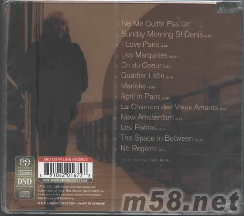 1、NE ME OUITTE PAS 2、SUNDAY MORNING ST DENIS 3、I LOVE PARIS 4、LES MARQUISES 5、CRI DU COEUR 6、QUARTIER LATIN 7、MARIEKE 8、APRIL IN PARIS 9、LA CHANSON DES VIEUX AMANTS 10、NEW AMSTERDAM 11、LES PEOTES 12、THE SPACE IN BETWEEN 13、NO REGRETS