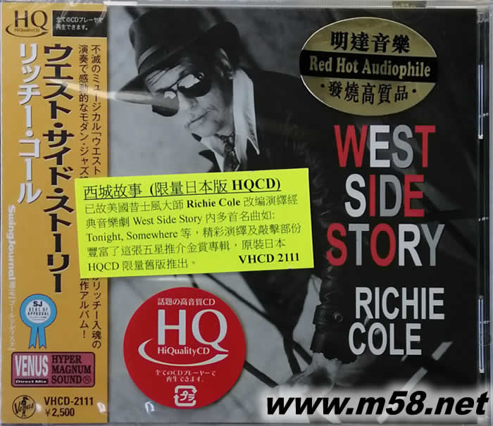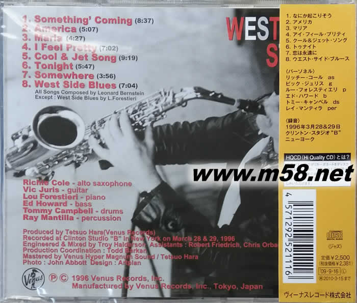 WEST SIDE STORY西城故事 RICHIE COLE HQCD 日本版(m58.net) 美國著名昔士風大師Richie Cole得獎名盤,改編演繹Leonard Bernstein名作West Side Story內多首名曲如: Something's Coming, Tonight, Somewhere及West Side Blues等,日本著名爵士品牌Venus Records以單層SACD推出,這個備受發燒友及音響界推崇的制式提供如在現場欣賞的靚絕音效。原裝日本豪華厚紙限量版。(只能以SACD機播放)