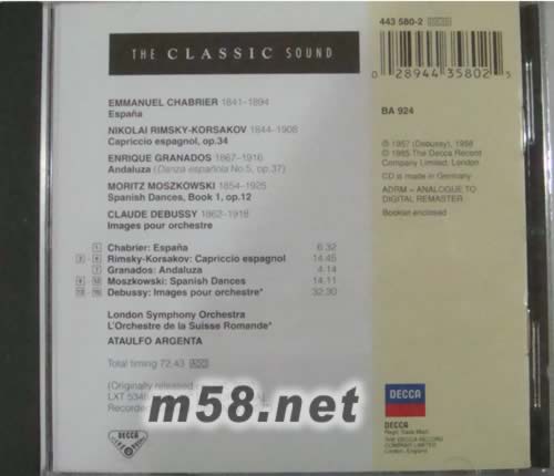 1.RIMSKY-KORSAKOV:CAPPRICIO ESPAGNOT,OP.34 I.ALBORADA II.VARIAZIONI III.ALBORADA IV.SCENA E CANTO GITANO 2.GRANADOS:ANDALUZA,DANZA ESPANOLA NO.5 OP.37 3.OHABRLER ESPANA MOSZKOWSKI;SPANISH DANEES.BOOK I,OP.12 4.NO.1 IN C MAJOR 5.NO.2 IN C MINOR 6.NO.3 IN A MAJOR 7.NO.4 IN B FLAT MAJOR 8.NO.5 IN C MAJOR