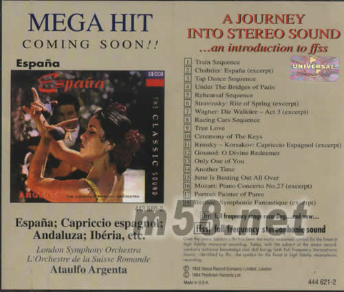 這張唱片的封面是一輛急馳而來的火車頭,故通稱“火車頭”,該片只有30分鐘多一點,時間不長,但曲目動聽,選擇了DECCA的精彩錄音片段。曲目之間有關于立體聲知識的英文講解。另外還有一些音效片段,如火車進站,士兵換崗,賽車飛馳等。聽完這張唱片,相信你會了解DECCA錄音的“水簾式音響”是怎么一回事了。