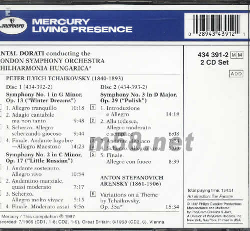 DISC 1 SYMPHONY NO.1 IN G MINOR OP.13(WINTER DREAMS) 1.ALLEGRO TRANQUILLO 2.ADAGIO CANTABILE MA NON TANTO 3.SCHERZO.ALLEGRO SCHERZANDO GIOCOSO 4.FINALE.ANDANTE LUGUBRE-ALLEGRO MAESTOSO SYMPHONY NO.2 IN C MINOR,OP.17(LITTLE RUSSIAN) 5.ANDANTE SOSTENUTO ALLEGRO VIVO 6.ANDANTINO MARZIALE QUASI MODERATO 7.SCHERZO ALLEGRO MOLTO VIVACE 8.FINALE.MODERATO ASSAI