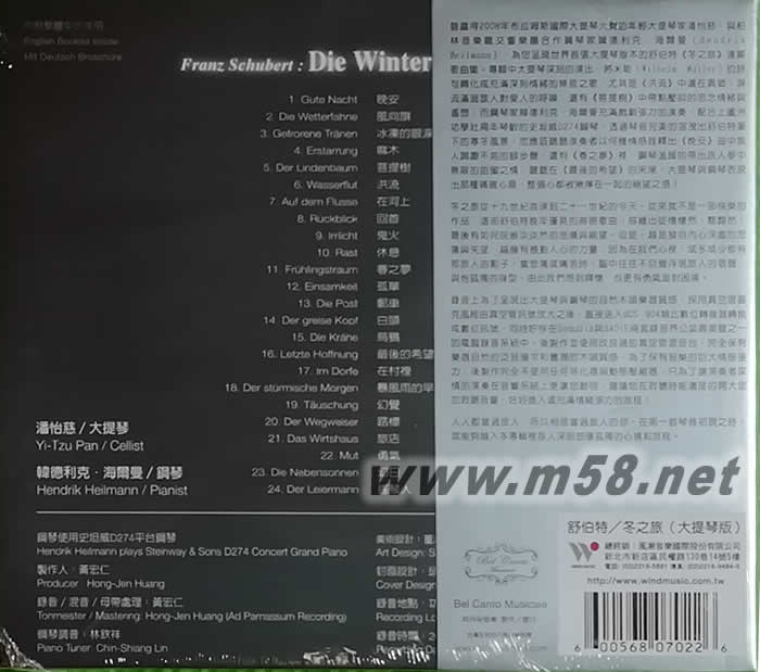 由剛贏得2008年布拉姆斯國際大提琴大賽,且是現任柏林交響樂團大提琴家的潘怡慈,與柏林愛樂交響樂團鋼琴家韓德利克?海爾曼(Hendrik Heilmann),攜手為您呈現世界首張大提琴版本的舒伯特《冬之旅》連篇歌曲集。專輯中大提琴深刻的演出,將米勒(Wilhelm Müller)的詩句轉化成充滿深刻情緒的無言之歌,尤其是《洪流》中遠在異鄉,淚流滿面旅人對愛人的呼喚、還有《菩提樹》中帶點壓抑的思念情緒與遙想