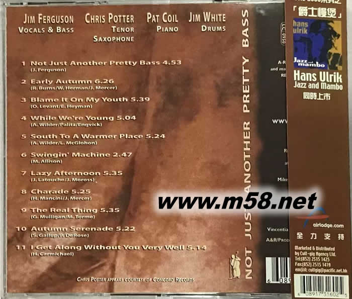 JIM FERGUSON 牛筋大王 NOT JUST ANOTHER PRETTY BASS(m58.net) Made in EC、1999年歐版有ifpi無條碼、荷蘭Challenge唱片公司。音響發燒迷最喜歡、牛筋味道特別濃郁、牛筋新貴Jim Ferguson新作中兼彈且唱,連同藍雨傘發燒琴王柏戈爾及Sax紅人基司樸特散發驚天動地效果。