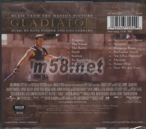 01. Progeny 02. The Wheat 03. The Battle 04. Earth 05. Sorrow 06. To Zucchabar 07. Patricide 08. The Emperor is Dead 09. The Might of Rome 10. Strength and Honor 11. Reunion 12. Slaves to Rome 13. Barbarian Horde 14. Am I Not Merciful? 15. Elysium 16. Honor Him 17. Now We Are Free