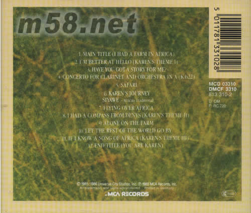 1.MAIN TITLE(I HAD A FARM IN AFRICA) 2.I'M BETTER AT HELLO(KAREN'S THEME I) 3.HAVE YOU GOT A STORY FOR ME? 4.CONCERTO FOR CLARINET AND ORCHESTEA IN A (K.622) 5.SAFARI 6.KAREN'S JOURNEY SIYAWE---Afeican Traditional 7.FLYING OVER AFRICA 8.I HAD A COMPASS FROM DENYS(KAREN'S THE ME LL) 9.ALONE ON THE FARM 10.LET THE REST OF THE WORLD GO BY 11.IF I KNOW A SONG OF AFRICA(KAREN'S THE ME III) 12.END TITLE(YOU ARE KAREN)