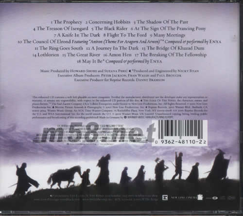 1.The Prophecy 2.Concerning Hobbits 3.The Shadow Of The Past 4.The Treason Of Isengard 5.The Black Rider 6.At The Sign Of The Prancing Pony 7.A Knife In The Dark 8.Flight TO The Ford 9.Many Meetings 10.The Council Of Elrond Featuring"Aniron(Theme For Aragorn And Arwen)"+Composed & Performed by ENYA 11.The Ring Goes South 12.A Journey In The Dark 13.The Bridge Of Khazad Dum 14.Lothlorien 15.The Great River 16.Amon Hen 17.The Breaking Of The Fellowship 18.May It Be+Composed & Performed by ENYA