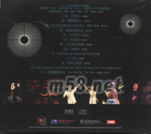 1、SYMPHONIM MEDLEY 林憶蓮/倫永亮 愛(ài)的世界/心田/一輩子心情/每一個(gè)早上/感覺(jué)完美/每次我展開翅膀/你是我的男人/情暖情醉情牽 2、日與夜/倫永亮 3、鋼琴后的人/倫永亮 4、你知道我在等你嗎?/我為你而生/總有你鼓勵(lì)/倫永亮 5、愛(ài)過(guò)就是完全/倫永亮 6、心仍是冷/倫永亮 7、好春宵/倫永亮 8、芝加哥的故事/林憶蓮 9、沒(méi)結(jié)果/林憶蓮 10、THE WAY HE MAKES ME FELL/林憶蓮 11、哭/林憶蓮 12、赤裸的秘密/林憶蓮 13、HOW COULD AN ANGEL BREAK MY HEART/ALMOST OVER YOU 林憶蓮/倫永亮 14、逃離鋼筋森林/LET ME BE THE ONE 林憶蓮/倫永亮