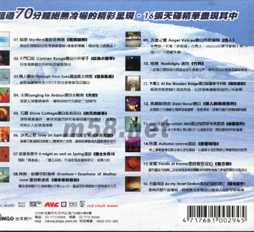 1、stica 秘密/選自班得瑞《玻璃湖畔》樂迷引頸期盼的班得瑞樂團第張最新專輯,電臺強力選取播曲 2、rmen Rouge 卡門口紅/選自川井郁子《紅色小提琴》日本偶像劇女令的炫火技飆風(fēng)演出 3、rough Your Eyes 情人眼中/THROUGH YOUR EYES選取自凱文柯恩《云淡風(fēng)輕》新世紀(jì)鋼琴天王2002年來臺音樂會指定曲目 4、天欲LONGING FOR ARDOUR/選自王曉南《天欲》胡琴女神驚爆樂界,傳奇與現(xiàn)代交鋒的二胡奇作 5、Stone Cottage 石屋/選自依莉莎白《秋天的故事》深受專業(yè)樂評、樂迷邀賞的新印象樂派鋼琴女詩人,道盡秋天與女人的浪漫情事 6、Time on Earth 沙河之歌/選自雷恩克里菲《沙河之歌》美國亞馬遜網(wǎng)站愛樂人顆星強力推薦,豐富配器重現(xiàn)古羅馬輝煌盛世 7、It might as well as Spring 就像是春天/選自《爵士女伶3》電影《真善美》《國王與我》作曲家理查羅杰斯又一金獎力作 8、Overture˙Seashore of Motherland 序曲‧記憶中的海岸/OVERTURE·SEASHORE OF MOTHER LAND 選自郭虔哲《爆米得的滋味》屢登連鎖唱片行演奏百行榜TOP 20,滿溢思鄉(xiāng)情懷的大提琴跨年力作 9、Angel Voices 天使之聲/選自丹尼瑞特《情人》世界第一名琴[史坦威]代言人,BILLBOARD新世紀(jì)榜上榜12周TOP 20超級天碟 10、Nostalgia 思鄉(xiāng)選自/選自《竹吟》20余種竹制樂器共同譜出全竹音像世界,精準(zhǔn)定位的發(fā)燒名盤首選取曲 11、At the Wooden Bridge 木橋上/選自保羅麥可利斯,《綠色森林》華視夜間新聞片尾指定曲,以原音樂器展現(xiàn)自然山林美景 12、Debi llorar 我應(yīng)該哭的/DEBL LLORAR選取自《愛人的異想世界》迷倒眾生的慵懶女聲與唯美鋼琴、低音提琴、鼓樂共譜的浪漫南歐情歌 13、Mountain Mist 山林迷霧/選自強尼斯林斯泰德《美麗世界》美國BILLBOARD新世紀(jì)榜上榜3周TOP20超極天碟,無我境地的吉他飆奏! 14、Autumn Leave 秋葉/選自《欲望城市》最愛的爵士樂手史坦蓋茲,以都會手法詮釋爵士樂最雋永的經(jīng)典 15、Fields of Home 家園 /選自雷恩寇伯《東方戀》當(dāng)代魔向大師與二胡名字高韶青跨國聯(lián)演克爾特與東方神秘主義的完美演出 16、As my Heart Desires 心靈渴望/選自約翰安鐸尼,《星光滿天》音樂抒壓作曲權(quán)威,解讀星光密碼譜出澄凈人心的寧靜樂章