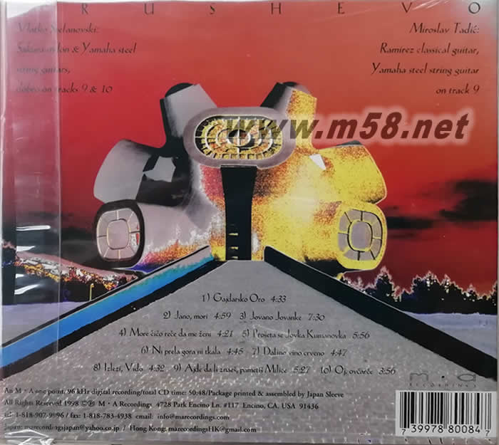 世界的屋脊 Krushevo 劉漢盛推介(m58.net) 音響論壇劉漢盛先生「總編私房軟體」推薦! ★ 融入搖滾、爵士、藍調(diào)、東歐傳統(tǒng)民謠,極其多元化的炫目風(fēng)格,以高超演奏技巧緊緊抓住融合音樂的精髓! ★ MA頂級錄音技巧,鉅細靡遺展現(xiàn)吉他音色的種種極限與可能性,絕對是融合音樂空前絕后的最佳示范片! 來自馬其頓的吉他演奏家維爾托克.史蒂芬諾夫斯基,曾是馬其頓最大搖滾樂團的創(chuàng)始人,他們結(jié)合搖滾、爵士、傳統(tǒng)馬其頓音樂的多元化型態(tài)令人讚嘆不已,這種演出方式也啟發(fā)他的思維,單用一把吉他,便能詮釋出各式各樣不同的音樂元素、並捕捉到融合(Fusion)音樂獨特的神韻。 這次,他與來自南斯拉夫的米洛斯拉夫.泰迪克合作,從古典吉他、巴洛克式風(fēng)格、藍調(diào)、爵士、印地安文明、乃至佛朗明哥炫技式的電吉他都成為他們的創(chuàng)作元素,家鄉(xiāng)的東歐民謠更貫穿其中, 輕柔內(nèi)斂的氣息與碰撞彈射的火光交織閃現(xiàn),精致的錄音更完全保留所有細節(jié)和空間感,絕對能讓您驚艷於吉他無限的可能! MA 負責(zé)人 Todd 認識二位吉他圣手,一位是在馬其頓呼風(fēng)喚雨 Vlatko Stefanovski,一位是南斯拉夫樂壇上倍受推崇的 Miroslav Tadic,把兩人集合起來出專輯,讓不少吉他樂迷大飽耳福。二把吉他唱和默契佳,演奏技巧更是一把罩,我對面的編輯同仁洪瑞鋒說:「回家把燈關(guān)掉,好好聽這張專輯,真的是太享受了……」--313 期音響論壇 資深編輯周靖庭