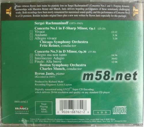 Sergei rachmaninoff(1873-1943) Concerto No. 1 in F-Sharp Minor, Op. 1 1.Vivace 2.Andante 3.Allegro vivace Chicago symphony orchestra fritz reiner,conductor concerto No.3 in D Minor op.30 4.Allegro ma non tanto 5.Intermezzo: Adagio 6.Finale: Alla breve