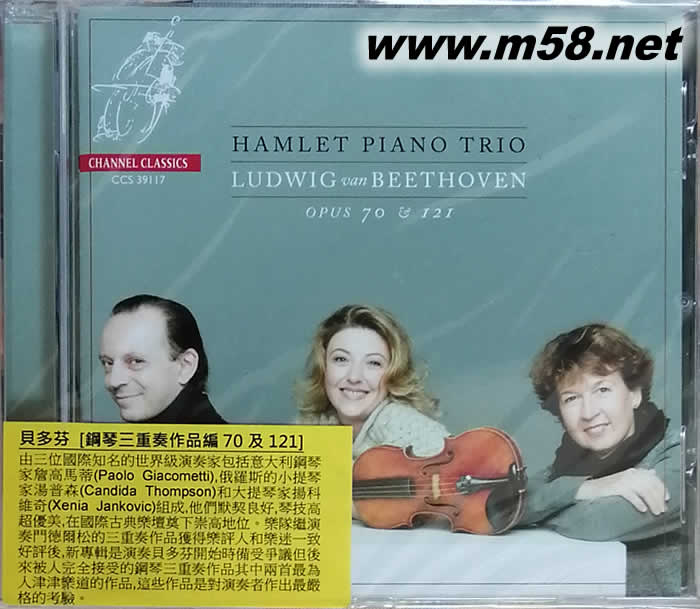 貝多芬 [鋼琴三重奏作品編70及121] Beethoven [Piano Trios Opus 70 & 121](m58.net) Paolo Giacometti (piano)、 Candida Thompson (violin)、Xenia Jankovic (cello) 1. 由三位國際知名的世界級演奏家包括意大利鋼琴家保羅.詹高馬蒂(Paolo Giacometti),俄羅斯的小提琴家坎迪達.湯普森(Candida Thompson)和大提琴家森妮雅.揚科維奇(Xenia Jankovic)組成,他們默契良好,琴技高超優美,在國際古典樂壇奠下崇高地位。 2. 樂隊繼演奏門德爾松的三重奏作品獲得樂評人和樂迷一致好評后,新專輯是演奏貝多芬開始時備受爭議但后來被人完全接受的鋼琴三重奏作品其中兩首最為人津津樂道的作品編號70和121(Piano Trio No. 5 in D major, Op. 70 No. 1 'The Ghost' & Piano Trio No. 6 in E flat major, Op. 70 No. 2 and Variations in G major on Wenzel Muller's ich bin der Schneider Kakadu, Op. 121a),這些作品是對演奏者作出最嚴格的考驗。 3. 詹高馬蒂那流暢鏗鏘,如大珠小珠落玉盤的琴音由湯普森抑揚有致,順滑如絲的小提琴演奏,配合揚科維奇溫婉中帶著剛勁的大提琴優雅地襯托著,將貝多芬的名作以極誘人的姿態呈現。
