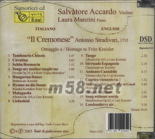 STRADIVARI II CREMONESE阿卡度克里蒙斯(m58.net) 收錄阿卡度利用史特拉底瓦裹1715年的[克裹蒙斯]灌錄克萊斯勒創作與改編的小品集。包括“匈牙利舞曲”、“愛之悲”及“無言之歌”等。阿卡度與MANZINI融合度十分高,兩人演奏默契十足,阿卡度的甜美銘器之聲,將每首小品演奏得動人心弦。