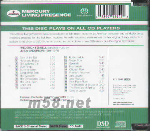 1 Belle of the Ball 2 Horse and Buggy 3 The Waltzing Cat 4 Blue Tango 5 Summer Skies 6 Song of the Bells 7 The Typewriter 8 The Syncopated Clock 9 The Girl in Satin 10 China Doll 1 Saraband 12 Fiddle-Faddle 13 Sleigh Ride 14 Serenata 15 Promenade 16 Chicken Reel 17 Phantom Regiment 18 Jazz Legato 19 Jazz Pizzicato 20 Plink Plank Plunk 21 The Bluebells of Scotland 22 The First Day of Spring 23 Song of Jupiter