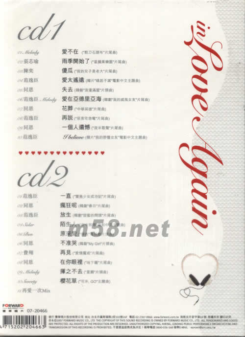 再愛一次(m58.net) 收錄MELODY與范逸臣全新情歌極品 愛不在MELODY (華視[剪刀石頭布]連續劇片尾曲) 一直范逸臣(華視[寶島少女成功記]連續劇片尾曲) 同輯收錄 范逸臣.費翔.MELODY.同恩.SOLER.SWEETY.陳奕.張芯瑜.BEN等深情K歌