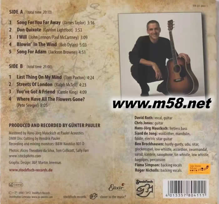 珠玉再現 more pearls (Vinyl 黑膠) 劉漢盛推介(m58.net) 最頂級的錄音 最發燒的人聲 Stockfisch唱片錄音採用二十八位元的類比數位轉換器、NAGRA-D等超發燒設備錄製,並以B&W NAUTILUS 801進行鑑聽。 劉名振主筆 這張專輯源起於2005年初大衛羅斯與Stockfisch老板Paul Gunter的一次談話。當他們談到下張專輯的方向時,Paul Gunter建議:何不考慮製作一張全部由「經典歌曲」組成的唱片?大衛羅斯說:「我一直想做張這樣的專輯!」於是他挑選歌曲,與Paul Gunter討論過后,再次與吉他手克里斯瓊斯進了Stockfisch的錄音室,開始這張專輯的錄製工作。 由大衛羅斯來進行這樣的專輯真是再適合不過了。先前翻唱的唐麥克林經典歌曲「Vincent」已經成為音響迷們最愛的測試曲目之一,因為他的歌聲醇厚沉穩,配上Stockfisch極佳的製作錄音水準,總能帶給聽者極大的聆樂享受。在這張專輯中他所選的歌曲更能看出他對於民謠涉獵之廣。像是詹姆斯泰勒的冠軍曲「You`ve Got A Friend」(由卡洛金譜寫)、巴布迪倫的「Blowin` In The Wind」、披頭四的「I Will」等等,都是大家耳熟能詳的經典。其他也有一些較不為人知的歌曲,像是詹姆斯泰勒的「Song For You Far Away 」、保羅賽門的「American Tune」等等,顯示大衛羅斯對於歌曲的選擇有著極佳的品味。 在編曲上這張專輯以簡單的雙吉他伴奏為主,偶而出現的打擊樂器與合聲則豐潤了歌曲的生命。最明顯的例子就是「I Will」,細碎的打擊樂器與輕柔的人聲讓這首簡單動聽的歌曲顯得更為不凡。大衛羅斯認為:「這些歌曲就像是珍貴的老朋友般,值得去重新探訪、重新學習,從中得到更多的內涵。」 錄音當然還是Paul Gunter的一貫高水準。吉他清脆中帶有金屬的質感與彈性、人聲豐潤飽滿,空間感與立體感都是一等一的水準。這張專輯也以SACD型式發售,擁有 SACD 播放機的朋友們可以擁有更進一步的聆聽體驗,一般CD唱盤播放起來當然也已經能讓你體會到Stockfisch杰出的錄音成就。