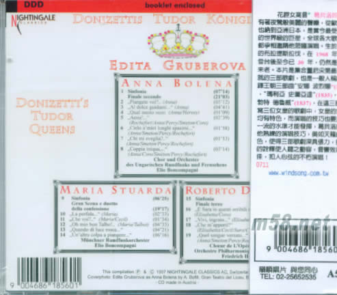 花腔女高音“葛貝洛娃”有著夜鶯般美麗的聲嗓,從歐洲維也納到亞洲日本,是當今最受注目的世界級的巨星,全球各大歌劇院都爭相邀請他蒞臨演唱。生於薩克的布拉提拉伐,在1968年首次登臺后至今已30年,仍然是寶刀未老。本片是集合董尼采第最高成就的三部歌劇,也是一般人稱的都鐸王朝三部曲“安娜 波烈娜”(1830),“瑪利亞 史圖亞達”(1835),“羅勃特 德魯威”(1837),在這三部描寫三位女皇的歌劇中,女皇的角色均有特色,而演唱的技巧也要達到一流的水準才能發揮,葛貝洛娃已他熟練的演唱技要,美如天籟的音色,使得三部歌劇深具張力,獨特的詮釋使人聽之動容,音響效果又佳,扣人心弦的不朽演唱!