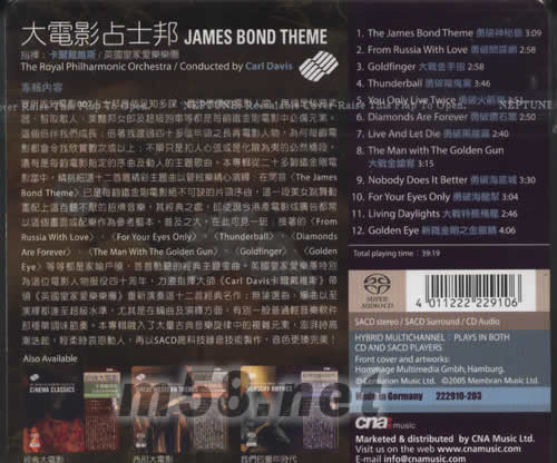 價格為估,以實到貨為準! 大電影占士邦紀念專輯及JAMES BOND THEMES SACD(m58.net) 指揮:卡爾載維斯 眾所周知電影007占士邦是個足知多謀、風流倜儻的電影人物,無論是秘密武器、智取敵人、美艷邦女郎及超級跑車等都是每部鐵金剛電影中必備元素。 這個倍伴我們成長:倍著我渡過四十多個年頭之長青電影人物,為何每部電影都會令我欣賞數次或以上;不單只是扣人必弦或是化險為夷的必然橋段,還有是每部電影指定的序曲及動人的主題歌曲。本專輯從二十多部鐵金剛電影當中,精挑細選十二首最精彩主題曲以管弦樂精心演譯:在開首〈THE JAMES BONB THEME〉已是每部鐵金剛電影不可缺的片頭曲,這一段美女跳舞動畫配上這百聽不厭的招牌音樂,其典之處,即使現今港產電影或廣告都常以這個畫面或配樂作為參考藍書,普及之大,在此可見一斑:接著的〈FROM RUSSIA WITH LOVE〉、〈FOR YOUR EYES ONLY〉、〈THUNDERBALL〉、《DIAMONDS ARE FOREVER》、 〈THE MAN WITH THE GOLDEN GUN〉〈GOLDFINGER〉〈GOLDEN EYE〉等等都是家喻曉、首首動吸的經典主題金曲。英國皇家樂園特別為這們電影人物服役四十周年,力邀指揮大師〈CARL DAVIS卡爾戴維斯〉帶領〈英國看家愛樂樂團〉重新演秦這十二首經典名作;無論選曲、編曲以至演譯都達至超級水準,尤其是在編曲及演譯方面,有別一般普通經音樂軟件那種單調味節秦。本專輯融入了大量古典音樂旋律中的復雜元素,澎時高潮迭起,經柔時哀怨動人,再以SACD 高科技錄音技術制作,音色更臻完美!