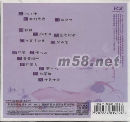 價格為估,以實到貨為準! 昨夜蔡琴(m58.net) 蔡琴的發燒唱片,是不少樂迷經常要來試人聲的首選,相信ABC新出的這款XRCD K2版《昨夜蔡琴》,未來也將會是經典之一。《昨夜蔡琴》這張唱片所收錄的是蔡琴早年的作品,ABC將模擬時代的原裝母帶,拿去以XRCD K2格式重新制作,并經過MANLEY參數式電子管均衡器作母帶的后期處理,音色調配和諧,在Hi-Fi音響中聆聽,令人賞心悅耳! 蔡琴那富有磁性魅力的嗓音,同時配樂也有不俗的質感和空間平衡感,蔡琴憂怨而帶磁性的嗓子把歌曲的神髓演繹得如天使之音,聽之使人落淚。最重要是音色溫潤,高低頻的延伸平順自然,鼓聲飽實,音像細膩,人聲厚實,空氣感也不錯。而這款應用了XRCD K2技術的唱片,定價只是中價唱片的水平,性價比頗佳,發燒樂迷萬勿錯過。