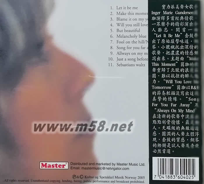 MAKE THIS MOMENT(此刻情懷)(m58.net) 發燒女聲天碟 人聲及音效天碟之必然之選 濃濃情感中流露出刻骨情懷 深情歌聲演繹多首經典情歌 此刻情懷 MAKE THIS MOMENT 茵珈INGER MARIE GUNDERSEN 實力派美聲女歌手INGER MARIE GUNDERSEN茵珈最新專輯,演繹我首經典情歌,一個樂手的精彩演出令人難忘.開首一曲'LET IT BE ME ',套鼓帶出了原始敲擊味道,鋼琴,小號襯托出深情的歌聲,把濃濃的情感傾瀉出來. 主題曲'MAKE THIS MOMENT',茵珈的歌聲重歸了北歐的浪漫莊園, 難以抗拒的醉人魅力.'WILL YOU STILL LOVE ME TOMORROW'茵珈以R&B 的節奏輕描淡寫出這段真摯的情緣.'SONG FOR YOU FAR AWAY'及'ALWAY ON MY MIND',在清新的歌聲中流露出點點刻骨情懷最是動人.天碟級的無敵通透感,圓潤的人聲立體浮現,套鼓的質感,鋼琴的鏗鏘,是試人聲及音效必然首選.