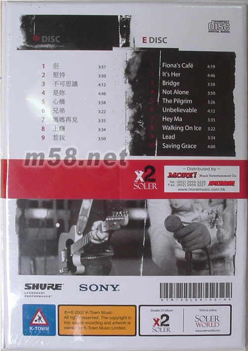 CD 1 - 中 01. 佢 02. 堅持 03. 不可思議 04. 是你 05. 心橋 06. 兄弟 07. 媽媽再見 08. 上癮 09. 惹我 CD 2 - English 01. Fiona's Cafe 02. It's Her 03. Bridge 04. Not Alone 05. The Pilgrim 06. Unbelievable 07. Hey Ma 08. Walking On Ice 09. Lead 10. Saving Grace