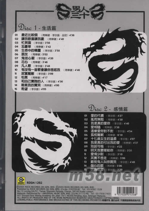 Disc 1 生活篇 01. 最近比較煩(周華健 李宗盛 品冠) 02. 讓我歡喜讓我憂(周華健) 03. 忙與盲(李宗盛) 04. 忘憂草(周華健) 05. 生命中的精靈(李宗盛) 06. 朋友(周華健) 07. 鬼迷心竅(李宗盛) 08. 花心(周華健) 09. 凡人歌(李宗盛) 10. 有沒有一首歌會讓你想起我(周華健) 11. 寂寞難耐(李宗盛) 12. 怕黑(周華健) 13. 和自己賽跑的人(李宗盛) 14. 親親我的寶貝(周華健) 15. 希望(李宗盛) Disc 2 感情篇 01. 愛的代價(李宗盛) 02. 風雨無阻(周華健) 03. 我是真的愛你(李宗盛) 04. 愛相隨(周華健) 05. 這樣愛你對不對(李宗盛) 06. 孤枕難眠(周華健) 07. 十七歲女生的溫柔(李宗盛) 08. 我是真的付出我的愛(周華健) 09. 別說可惜(李宗盛) 10. 明天我要嫁給你(周華健) 11. 愛情少尉(李宗盛) 12. 其實不想走(周華健) 13. 聽見有人叫你寶貝(李宗盛) 14. 傷心的歌(周華健) 15. 因為寂寞(李宗盛)