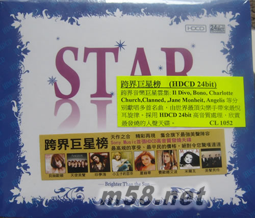 Star Brighter Than the Sun(HDCD)跨界巨星榜(HDCD)(m58.net) 天作之合 精彩再現史上第一次!響韻與Sony Music 聯手推出國際最強跨界巨星合輯的發燒天碟頂級美聲搭配HDCD高音質處理,絕對令您讚聲連連!Il Divo、Angelis、Fiona Apple、珍夢海、夏綠蒂、小王子約瑟芬等超豪華卡司,更將母帶送至新加坡后製處理,採用HDCD(High Definition Compact Disc) 24Bit高規格,讓您享受一般CD 16Bit聽不到的超高品質。如此堅強的跨界明星陣容、如此堅持的重金母帶后製,《跨界巨星》要您愛不釋手!