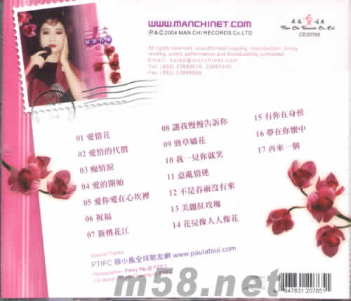 1.愛情花 2.愛情的代價 3.癡情淚 4.愛的開始 5.愛你愛在心坎里 6.祝福 7.新桃花江 8.讓我慢慢告訴你 9.勁草嬌花 10.我一見你就笑 11.意亂情迷 12.不是春雨沒有來 13.美麗紅玫瑰 14.花兒像人人像花 15.有你在身旁 16.夢在你懷中 17.再來一個