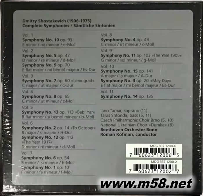 肖斯塔科維奇 交響曲全集 SHOSTAKOVICH COMPLETE SYMPHONIES SAMTLICHE SINFONIEN BEETHOVEN ORCHESTER BONN(11CD套裝)(m58.net) 肖斯塔科維奇,原蘇聯時期*重要的作曲家之一,20世紀世界著名作曲家之一 羅馬科夫曼(指揮)/波恩貝多芬管弦樂團/這一場是精彩的表演,細膩的聲音被細致的構建,高精度的傳遞,但旋律線的味道——所謂的最具音樂性的“美”! MDG 是一個追求發(fā)燒品質的古典唱片小廠---錄音無可挑剔。創(chuàng)立時期,它確立了追求“自然”的錄音哲學,包括:自然的樂器、人聲音色,自然的空間聲響,自然的寬廣度再現,樂器間自然的平衡感,樂器的自然動態(tài)和演奏錄音的自然流動感。此外考慮到重播的空間會決定重播的品質,又提出了空間的三要素:擺位、三度空間與現實狀況的概念。 MDG 在世界各地尋找合適的錄音場所,制作了不少演錄俱佳的唱片,也挖掘出許多優(yōu)秀的演奏家與團體。較重要的有漢堡交響樂團、18世紀室內合奏團(Camerata of the 18th Century),演奏家豎笛教授克勒克爾(Dieter Kloecker)、管風琴家奧斯登(Ben van Oosten)等。在 MDG 錄音的的音樂家,大多兼俱學者的身份,因此錄音格外富于人文氣息。