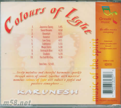 Colours of Light光之彩 新世紀純音樂(m58.net) 來自德國New Age名家Karunesh的早期作品最暢銷的新樂器專輯之一。 當Karunesh還是小孩的時候就與音樂結下了不解之緣,他曾以作曲者和鍵盤樂手的身份游歷了亞洲和美洲,由此結識了許多不同風格的音樂家,他們對他的影響完全可以從他的音樂中讀出來。活潑的旋律和愉悅的和諧在閃光的聲波里迸發出燦爛的光芒,把聽者引入一個和諧輕盈的世界。與神秘相得益彰的同時,這張專輯中的作品還特別適合于歡欣雀躍的氣氛。