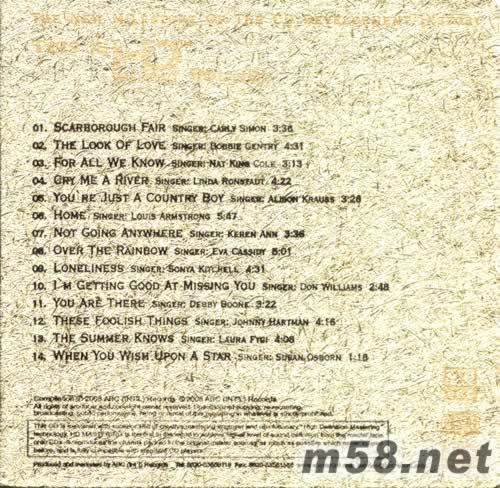 01、 Scarborough Fair Singer: Carly Simon 02、 The Look Of Love Singer: Bobbie Gentry 03、 For All We Know Singer: Nat King Cole 04、 Cry Me A River Singer: Linda Ronstadt 05、 You`re Just A Country Boy Singer: Alison Krauss 06、 Home Singer: Louis Armstrong 07、 Not Going Anywhere Singer: Keren Ann 08、 Over The Rainbow Singer: Eva Cassidy 09、 Loneliness Singer: Sonya Kitchell 10、 I’m Getting Good At Missing You Singer: Don Williams 11、 You Are There Singer: Debby Boone 12、 These Foolish Things Singer: Johnny Hartman 13、 The Summer Knows Singer: Laura Fygi 14、 When You Wish Upon A Star Singer: Susan Osborn