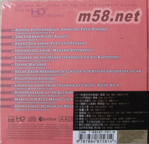 01 《如畫的景色組曲》選段 02 《卡門組曲》慢板 03 詩人與農夫 04 《蝴蝶夫人歌劇》間奏曲 05 火鳥之舞 06 之舞 07 圓舞曲 08 韃靼人之舞 09 破曉 10 莊嚴,不太快的快板 11 降B大調進行曲第99號 12 匈牙利狂想曲第2號