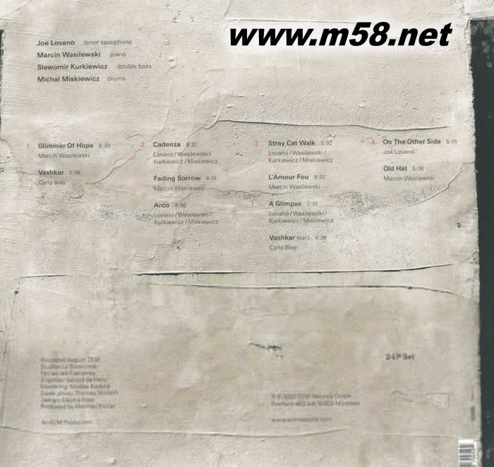 1 GLIMMER OF HOPE (Marcin Wasilewski) 08:33 2 VASHKAR (Carla Bley) 05:56 3 CADENZA (Marcin Wasilewski, Slawomir Kurkiewicz, Michal Miskiewicz) 09:12 4 FADING SORROW (Marcin Wasilewski) 06:01 5 ARCO (Marcin Wasilewski, Slawomir Kurkiewicz, Michal Miskiewicz) 04:00 6 STRAY CAT WALK (Marcin Wasilewski, Slawomir Kurkiewicz, Michal Miskiewicz) 02:32 7 L’AMOUR FOU (Marcin Wasilewski) 08:52 8 A GLIMPSE (Marcin Wasilewski, Slawomir Kurkiewicz, Michal Miskiewicz) 02:10 9 VASHKAR (VAR.) (Carla Bley) 04:38 10 ON THE OTHER SIDE (Joe Lovano) 05:01 11 OLD HAT (Marcin Wasilewski) 05:35