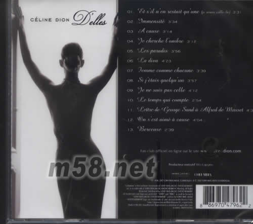 1.S’il n’en restait qu’une (je serais celle-là) 2.Immensité 3.La berceuse 4.A cause 5.A cause 6.La nuit femme comme chacune 7.Des paradis 8.Si j’étais quelqu’un 9.Je ne suis pas celle 10.Le temps qui compte 11.La diva 12.Je cherche l’ombre 13.La lettre de Georges Sand
