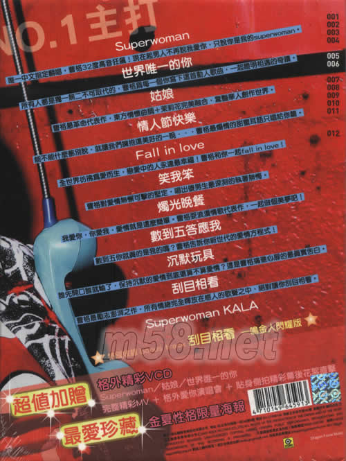格格BLUE 首張創(chuàng)作專輯(第三版)(m58.net) 史上最強(qiáng)超級男聲 唱作奇才GARY曹格 格式情歌當(dāng)?shù)? 襲倦全亞洲——金夏重裝改版 從冬天唱到夏天 從生澀進(jìn)階出色 全民注目度最 亞洲最亮眼新星 超值加贈 格外精彩VCD 最愛珍藏 金夏性格限量海報 Superwoman/姑娘/世界唯一的你 完整精彩MV+格外愛你演唱會+帖身側(cè)拍精彩幕后花絮直擊