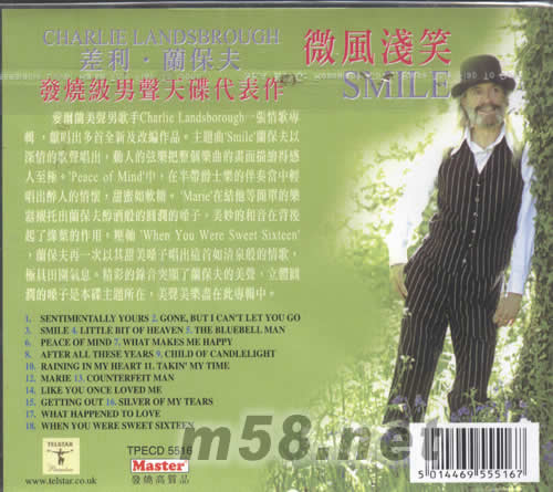 SMILE微風淺笑(m58.net) 請點看產品正、背面大圖 愛爾蘭當紅男歌手演繹,醇酒般的嗓子令人迷醉,發(fā)燒級男聲天碟代表作 發(fā)燒級男聲天碟代表作 愛爾蘭美聲男歌手CHARLIE LANDSBOROUGH一張情歌專輯,獻唱出多首全新及改編作品。主題曲SMILE蘭保夫以深情的歌聲唱出,動人的弦樂把整個樂曲的畫面描繪得感人至極。“PEACE OF MIND”中,在半帶爵士樂的伴奏當中輕唱出醉人的情懷,甜蜜如軟糖。“MARIE”在結他等簡單的樂器襯托出蘭保夫醇酒般的圓潤嗓子,美妙的和音在背后起了綠葉的作用。壓軸“WHEN YOU WERE SWEET SIXTEEN”,蘭保夫再一次以其圓潤嗓子唱出這首如清泉般的情歌,極具田園氣息。精彩的錄音突顯了蘭保夫的美聲,立體圓潤的人聲是本碟主題所在,美聲美樂盡在此專輯。