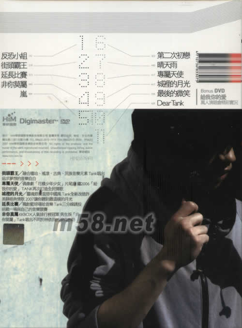 01. 反恐小組 02. 街頭霸王 03. 延長比賽 04. 非你莫屬 05. 嵐 06. 第二次初戀 07. 晴天雨 08. 專屬天使 09. 城里的月光 10. 最后的微笑 11. Dear Tank Bonus DVD 給我你的愛 萬人演唱會精彩實況 預購贈品:Tank創作demo獨家珍藏4首原創歌曲 01. baby(原唱:S.H.E OT:好人有好抱) 02. 超越極限(原唱:飛輪海 OT:我有我的Young) 03. 雪與淚(原唱:飛輪海 OT:夏雪) 04. 給我你的愛(DEMO版)(原唱:Tank OT:給我你的愛)