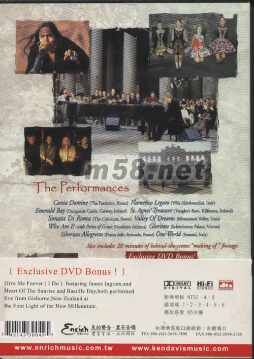 ONE WORLD 約翰泰許世界一家DVD(m58.net) 美國大峽谷上的鋼琴于印地安戰(zhàn)鼓、愛爾蘭古堡里居爾特風(fēng)笛與踢踏舞者。 羅馬神殿外磅礴的頌聲與小提琴、羲大利壯圓奔放的佛朗明哥舞者與吉他。 北亞利桑那州的甜美歌聲、置身文化瑰寶納向大師致敬的天籟美聲。 新世紀(jì)鋼琴才子遠(yuǎn)征世界文化之都*千變?nèi)f化的音樂風(fēng)格*絕美的地理景致 最動人的音樂*最美麗的畫面*影音雜志最佳推薦*影音發(fā)燒收藏極品