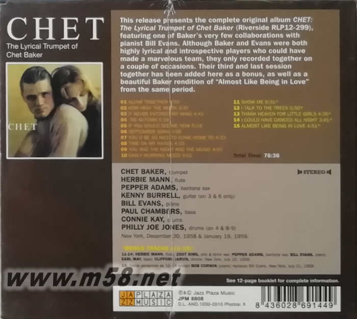 Chet: Lyrical Trumpet of Chet Baker (爵士大師五星系列)(m58.net) CHET BAKER 小號(hào) HERBIE MANN 長(zhǎng)笛 PEPPER ADAMS 薩克斯 KENNY BURRELL 吉它(ON 3 & 6 ONLY) BILL EVANS 鋼琴 PAUL CHAMBERS 低音大提琴 CONNIE KAY 鼓 PHILLY JOE JONES 鼓( ON 4 & 8-9) NEW YORK,DECEMBER 30 1958 & JANUARY 19 1959