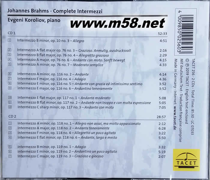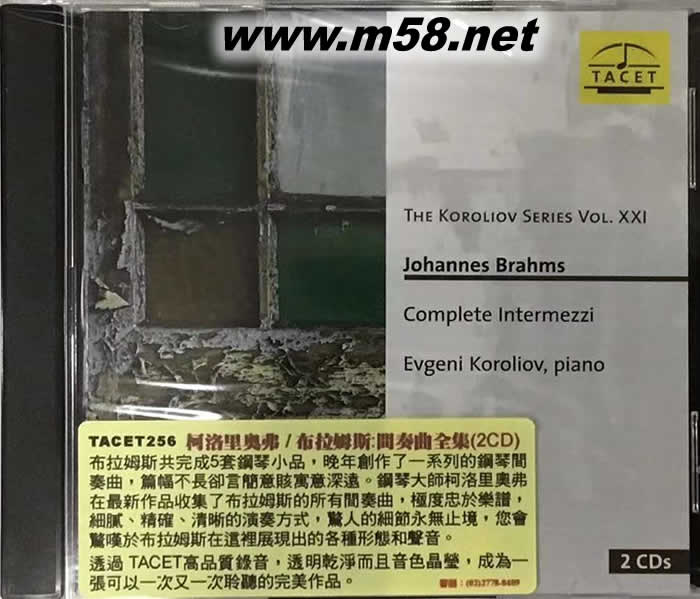 勃拉姆斯 間奏曲全集 Johannes Brahms : Complete Intermezzi(m58.net) 鋼琴大師柯洛里奧弗(Evgeni Koroliov)在最新作品收集了布拉姆斯的所有間奏曲,極度忠於樂譜,細膩、精確、清晰的演奏方式,驚人的細節永無止境,踏板的劑量,音平面的平衡,節奏的寧靜,注意沉默;樂器的絲般柔和的聲音也使人著迷,您會驚嘆於布拉姆斯在這里展現出的各種形態和聲音。 CD錄音地點在柏林的耶穌基督教堂,透過TACET高品質錄音,透明乾凈而且音色晶瑩,成為一張可以一次又一次聆聽的完美作品。