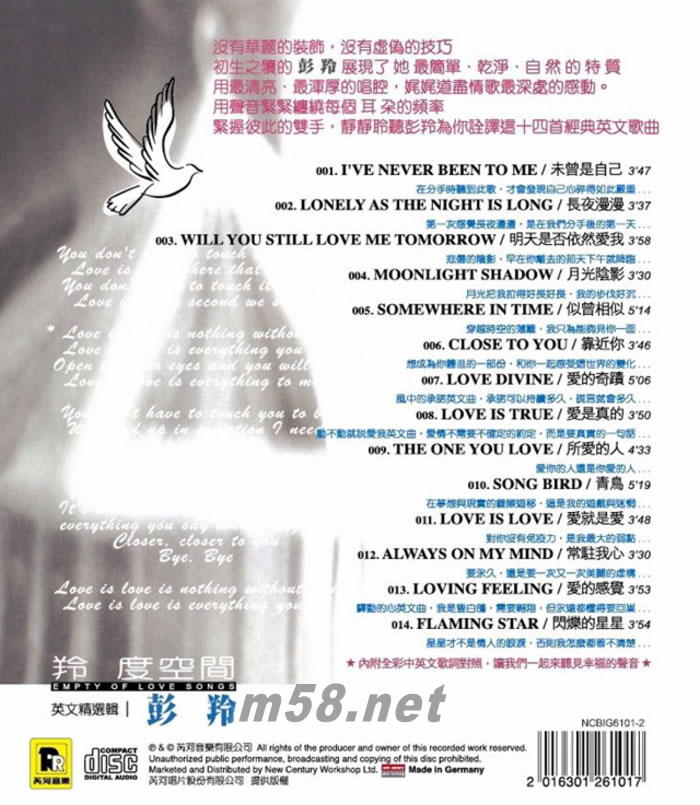 價格為估,以實到貨為準! 羚度空間(m58.net) 久違了的一張 彭羚 "羚度空間" 英文專輯 初生之犢的 彭 羚 展現了她最簡單、乾凈、自然的特質; 用最清亮、最渾厚的唱腔,娓娓道盡情歌最深處的感動。