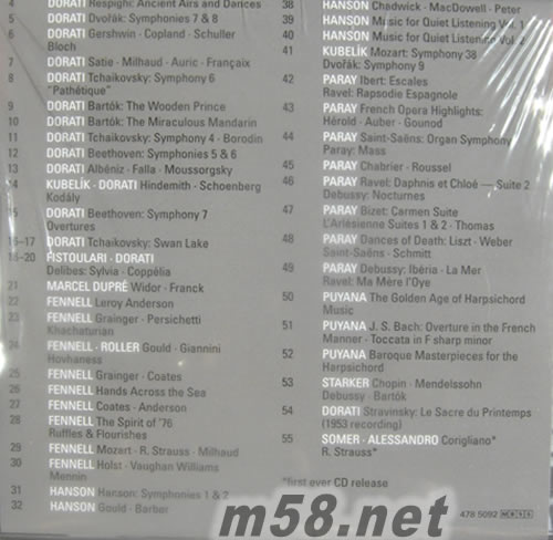 CD1] 勛伯格,韋伯恩,貝爾格:管弦樂作品。 安塔爾多拉蒂,倫敦交響樂團 1961-1962年[錄音] [CD2] 雷斯皮基:羅馬之松、羅馬的噴泉、鳥類、巴西映像。 安塔爾多拉蒂,明尼阿波利斯交響樂團 1957年和1960年[錄音] [CD3] 巴托克:樂隊協奏曲、舞蹈組曲等 安塔爾多拉蒂,倫敦交響樂團 1958年&1962 [錄音] [CD4] 雷斯皮基:3首古老的歌舞和詠嘆調 安塔爾多拉蒂,匈牙利愛樂樂團 1958 [錄音] [CD5] 德沃夏克:交響曲第7號和8號 安塔爾多拉蒂,倫敦交響樂團 1959年和1963年[錄音] [CD6] 格什溫:一個美國人在巴黎;科普蘭::牛仔芭蕾組曲等 安塔爾多拉蒂,明尼阿波利斯交響樂團 1957年和1960年[錄音] [CD7] 薩蒂:游行、米約:在屋頂上的公牛等 安塔爾多拉蒂,倫敦交響樂團 1965年和1960年[錄音] [CD8] 柴可夫斯基:第6號“悲愴”交響曲、羅密歐與朱麗葉 安塔爾多拉蒂,倫敦交響樂團 1959年和1960年[錄音] [CD9] 巴托克:為弦樂,打擊樂和鋼片琴所作的音樂等 安塔爾多拉蒂,倫敦交響樂團 1964年和1960年[錄音] [CD10] 巴托克:神奇的滿大人、嬉游曲等 安塔爾多拉蒂 - BBC交響樂團 1964年和1960年[錄音] CD11] 柴可夫斯基:第四交響曲、里米尼的弗蘭切斯卡等 安塔爾多拉蒂,倫敦交響樂團 1959年和1960年[錄音] [CD12] 貝多芬:交響曲第5號和6號、普羅米修斯的創造序曲 安塔爾多拉蒂,倫敦交響樂團 1962年和1960年[錄音] [CD13] 阿爾班尼士:伊比利亞組曲、法雅:人生朝露等 安塔爾多拉蒂,明尼阿波利斯交響樂團 1957-1958年 [錄音] [CD14] 巴托克:神奇的滿大人等 拉斐爾·庫貝利克,芝加哥交響樂團 1953年和1954年[錄音](單聲道) [CD15] 貝多芬:第七交響曲等 安塔爾多拉蒂,倫敦交響樂團 1960年至1963年[錄音] [CD16&17] 柴可夫斯基:“天鵝湖”舞劇音樂“(原始版本) 安塔爾多拉蒂,明尼阿波利斯交響樂團 1954年[錄音] [CD18-20] 德利布:芭蕾舞劇“希爾薇婭” 阿納托利Fistoulari,倫敦交響樂團 1958年[錄音] 德利布:芭蕾舞劇“葛蓓利亞” 安塔爾多拉蒂,明尼阿波利斯交響樂團 1957 [錄音] [CD21] 維多爾:管風琴交響曲第6號;弗蘭克:英雄小品等 馬塞爾·杜普雷(管風琴) 1957年 [錄音] [CD22] 勒羅伊·安德森:管弦樂小品 弗雷德里克芬內爾,伊士曼羅切斯特流行樂團 1958年和1964年[錄音] [CD23] 格蘭杰、哈恰圖良等:管弦樂小品 弗雷德里克芬內爾,伊斯曼管樂團 1958年和1959年[錄音] [CD24] 莫頓·古爾德:西部工廠交響曲,霍凡內斯:第4交響曲等 弗雷德里克芬內爾,伊斯曼管樂團 1958年和1959年[錄音] [CD25] 格蘭杰,科茨:管弦樂作品 弗雷德里克芬內爾,伊士曼羅切斯特流行樂團 1959年和1965年[錄音] [CD26] 索薩:進行曲集 弗雷德里克芬內爾,伊斯曼管樂團 1956年和1958年[錄音] [CD27] 安德森、科茨:管弦樂作品 弗雷德里克芬內爾,倫敦大眾管弦樂團、伊斯特曼羅切斯特通俗樂團 1964年和1965年[錄音] [CD28] The Spirit of '76等 弗雷德里克芬內爾,伊士曼管的合奏團成員 1956年[錄音] [CD29] 莫扎特:大組曲;R.施特勞斯:“小夜曲Op.7”等 弗雷德里克芬內爾,伊斯曼管樂團 1958年 [錄音] [CD30] 霍爾斯特:第1號和第2號組曲等 弗雷德里克芬內爾,伊斯曼管樂團 1954年和1955年[錄音] [CD31] 漢森:交響曲第1和第2號 霍華德漢森,伊士曼羅切斯特交響樂團 1957年和1958年的[錄音] [CD32] 莫頓·古爾德:福爾里弗傳奇;巴伯:美狄亞 霍華德漢森,伊士曼羅切斯特交響樂團 1959年和1960年[錄音] [CD33] 艾夫斯,威廉·舒曼,門寧:管弦樂作品 霍華德漢森,伊士曼羅切斯特交響樂團 1957年至1962年[錄音] [CD34] 漢森:第三號交響曲等 霍華德漢森,伊士曼羅切斯特交響樂團 1957年至1963年[錄音] [CD35] 皮斯頓、格里菲斯、凱南等:管弦樂作品 霍華德漢森,伊士曼羅切斯特交響樂團 1957-1963年 [錄音] [CD36] 麥克菲,塞申思,湯姆森:管弦樂作品 霍華德漢森,伊士曼羅切斯特交響樂團 1956年和1965年[錄音] [CD37] 摩爾、卡朋特、羅杰斯、菲利普斯:管弦樂作品 霍華德漢森,伊士曼羅切斯特交響樂團 年1956年-1958年[錄音] [CD38] 查德威克、麥克道威爾、彼得:管弦樂作品 霍華德漢森,伊士曼羅切斯特交響樂團 1956-1961年 [錄音] [CD39] 尼爾森、賽爾、蘇吉亞尼、高銀等:管弦樂作品 (Music for Quiet Listening Vol.1) 霍華德漢森,伊士曼羅切斯特交響樂團 年1958年至1962年[錄音] [CD40] 馬蒂努、格里格、李亞多夫、萊弗勒、漢森:管弦樂作品 (Music for Quiet Listening Vol.2) 霍華德漢森,伊士曼羅切斯特交響樂團 1956-1965年 [錄音] [CD41] 德沃夏克:第九交響曲“自新大陸”;莫扎特:第38交響曲 拉斐爾·庫貝利克,芝加哥交響樂團 1951年和1953年[錄音](單聲道) [CD42] 伊貝爾:港口;拉威爾:西班牙狂想曲、小丑的晨歌等 保羅·帕雷,底特律交響樂團 1959年和1962年[錄音] [CD43] 法國歌曲序曲 保羅·帕雷,底特律交響樂團 1961年和1962年[錄音] [CD44] 圣桑:第3交響曲“管風琴”;帕雷:“悼念圣女貞德逝世300周年彌撒曲” 保羅·帕雷,底特律交響樂團 1956年和1957年[錄音] [CD45] 夏布里埃爾:西班牙狂想曲等管弦樂作品;魯塞爾:組曲 保羅·帕雷,底特律交響樂團 1957-1960年[錄音] [CD46] 拉威爾,德彪西:管弦樂作品 保羅·帕雷,底特律交響樂團 1958-1961年 [錄音] [CD47] 比才:卡門組曲、阿萊城姑娘組曲;托馬斯:序曲 保羅·帕雷,底特律交響樂團 1956-1960年 [錄音] [CD48] 死之舞(韋伯,圣桑,R.施特勞斯,施米特等管弦樂作品) 保羅·帕雷,底特律交響樂團 1958年和1959年[錄音] [CD49] 德彪西:大海、牧神午后前奏曲等 保羅·帕雷底特律交